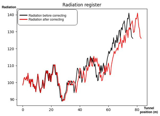 The radiation registered during a survey. The black line represents the radiation related to the position estimation by EKF, while the red line represents the radiation related to the position estimation by GGO, after finding a sector door at 82.81 m from the beginning.