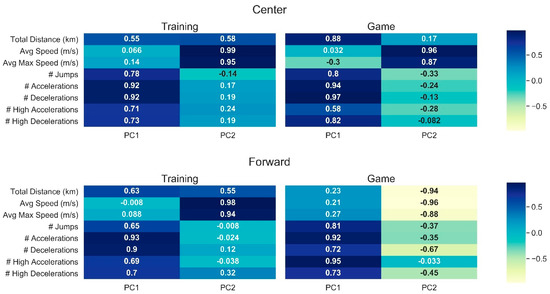 The eigenvalues, explained variance, and cumulative explained variance computed for PCA are presented in Table 4. Two components were retained for each model, which account for more than 70% of the variance in the data. The heatmaps in Figure 1 illustrate the loadings of variables in each PC after applying varimax rotation. Values greater than 0.7 are considered an indicator of a high loading of a variable in a PC [26]. Similar loading patterns were observed for each playing position during training, while distinct patterns were observed during game sessions.