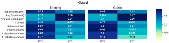 In regard to the PCA heatmaps in Figure 1, the interpositional variances are reasonable when examining both the technical and tactical demands of training and games [20,26,37,38]. External load among Centers is dictated by court transitions and ball screen situations (i.e., accelerations and decelerations). Additionally, the number of jumps under the goal as well as speed to quickly move to both defensive and offensive positions “in the paint” are other noted physical parameters for Centers. All these physical parameters are noted in Figure 1 as carrying the most weight in explaining the variance for external load and are commonly weighted for Centers between practice and games. Guards must be quick and agile; therefore, the impetus for external load is speed and jumping ability. Consequently, the same weighting as well as commonalities between practice and games for Guards is visualized in Figure 1. Finally, Forwards play in a hybrid position and must possess a broad array of physical parameters (i.e., endurance and speed) for in-game performance, and their external load during games may vary based on the opponent and specific demands of each individual competition which could explain how practice and game demands differed greatly for the second component weight in Figure 1. The similarity in the loading of the training sessions could be explained by the training activities, which might be less technical and generally train all the players in various positions. Previous research has also investigated the differences in training and match play [35,39].