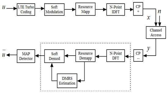 Turbo codes for modern error correction coding provide high error rate performance near the Shannon limits of error-correcting performance []. These excellent features of turbo codes have led to their adoption in many communication standards, including high-speed downlink packet access (HSDPA), wireless local area network (WLAN), LTE/LTE-A, and some portion of mMTC in 5G technology, although the performance of turbo codes comes at the expense of high decoding complexity and consequently high-power consumption [] at the receiver for proper decoding. Actually, the computational difficulty of the turbo decoder far exceeds that of other components in an LTE and NB-IoT receiver, especially for higher data rate and low latency communications. To make the uplink system more flexible, a frequency-domain minimum mean squared error (MMSE) equalizer in a soft interference cancellation (SIC) scheme has been used in the LTE uplink receiver for SC-FDMA. Motivated by this, the frequency domain equalizer (FDE) can be utilized []. Several iterative turbo decoding and equalization receiver schemes have been proposed in the literature [,]. In [], during the iterations, the equalizer coefficients remained constant, while in [] during the iterations, the equalizer was updated in conformity with a priori information received from the decoder. It was presented in [] that frequency domain equalization (FDE) can easily be applied to uplink NB-IoT system to eliminate the Inter-Symbol Interference (ISI) effect.