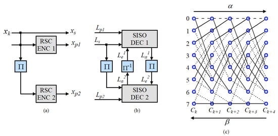 As shown in Figure 3, the turbo decoder performs decoding processes by exploiting a maximum a posteriori (MAP) algorithm, where the received signal sequence is demultiplexed into three sequences []: the systematic sequence and two parity sequences and . One SISO decoder utilizes and (or ) as inputs and computes the log-likelihood ratio (LLR) of each information bit based on the trellis structure in Figure 3c, which is defined for the -th information bit , as