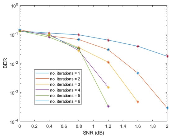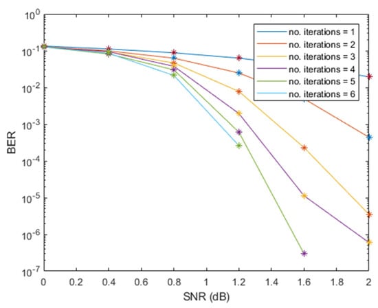 We evaluated the bit error rate (BER) performance for the number of decoding iterations against signal-to-noise ratio (SNR) as shown in Figure 4 and Figure 5, respectively. The BER performance of this scheme was achieved after I = 7 iterations were performed.