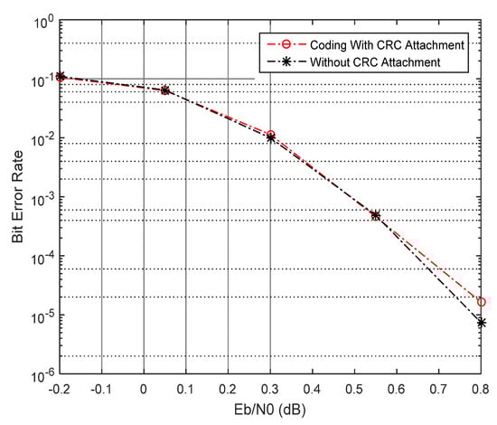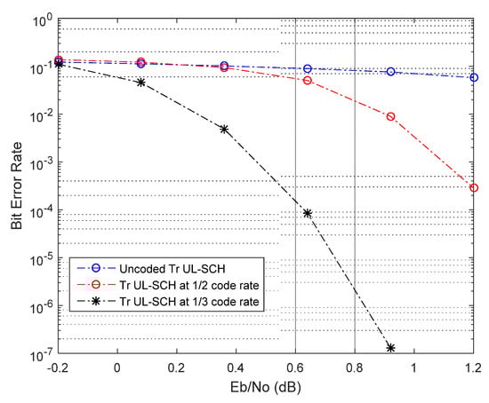 Wireless IoT systems are expected to offer coverage reachability of about 164 dB, battery life of 10 years, coverage density to support up to 10 million devices in a square km2, and a system throughput of 200 bps with processing latencies lower than 10 s [,]. Hence, choosing a suitable PHY layer technology is essential to meet the requirement. However, as specified in the 3GPP standard, NB-IoT is designed based on existing LTE PHY layer technology, with its baseband signals and channels inherited from LTE with additional repetition parameters to meet the demand. In the uplink technology, NB-IoT adopted LTE turbo coding as FEC and SC-FDMA as the multiplexing scheme [,] due to its advantage of Peak-to-Average Power Ratio (PAPR) that results from efficient power amplification compared to ordinary OFDMA technology. The main goal of Forward Error Correction (FEC) is to improve the transmission reliability with which user data may be conveyed through a noisy channel, such as a wireless communication channel or an imperfect information system. This is achieved by the addition of redundant information derived from the data to be conveyed prior to transmission over the noisy channel []. At the destination, the redundant bit of the transmitted data may be exploited in multiplex with the original information message to correct errors that may have been introduced by the channel [].