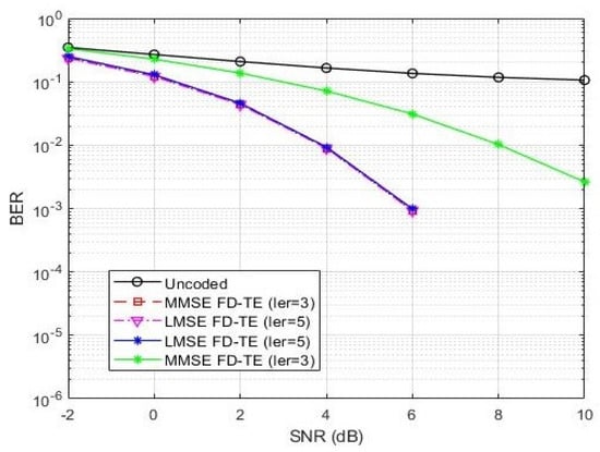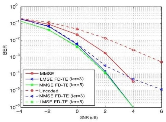 Computation complexity is derived from equalizer vectors. Symbol estimates in terms of complex multiplications and additions as summarized in Table 2. The conventional FD-MMSE equalization algorithm as given by (19) requires M complex multiplications to estimate the equalizer symbols. In the proposed FD-MMSE equalizer scheme, to suppress the MMSE estimation error, additional operations are required to be configured including the -point IFFT operation and -point FFT operation. Hence, its computational complexity in terms of cost is higher in comparison with conventional MMSE and LMSE schemes []. As a result, the additional computational cost consists of complex additions and complex multiplications.