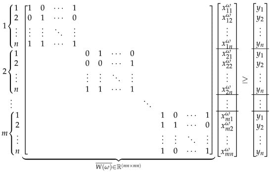 Note that the mathematical expressions defined in (8)–(13) of MP 3 have a similar interpretation as those stated in MP 2 for each scenario . The second component established in (8) represents the expected value of the distribution cost over the scenarios. Consider that the first decision stage to open a facility is given by binary variable y and the distribution of the demand is given by x as the second stage. Regarding the family of constraints formulated as in (11) of MP 3, each scenario is represented by a -matrix () of dimension , where each row has a one for each element of () and a zero for elements of its complement; see Figure 1. Furthermore, is a finite set but it can have a big cardinality. For example, if we consider no partial preferences and since , each row of () can be given in different ways. Thus, there are possible different matrices ().