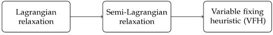 The 2S-SPLP has been widely studied, and its solution methods have been shown to be efficient. As mentioned in [], it is important to consider that, taking advantage of the structure of the problem, the 2S-SPLP is especially beneficial in stochastic mathematical programming, and it is the main focus of the algorithmic work in this area. Here, the concept of structure refers to any characteristic in the mathematical formulation that can be used to provide a solution. One of the most-used procedures for stochastic mathematical programming that involves integer variables is the so-called integer L-shape method proposed in []. This method is a branch-cut algorithm that uses the L-shape that the coefficient matrix has in the stochastic formulation of the 2S-SPLP and solves subproblems obtained by the Benders decomposition. For details of this and other similar procedures, see [,]. Lagrangian relaxation (LR) is a less-used approach, but a full description of different applications can be found in the references previously cited. Some gradient (subgradient)-based methods, such as those used in LR, were applied over other algorithms to speed up the search for the optimum in discrete problems; see [] as an example.