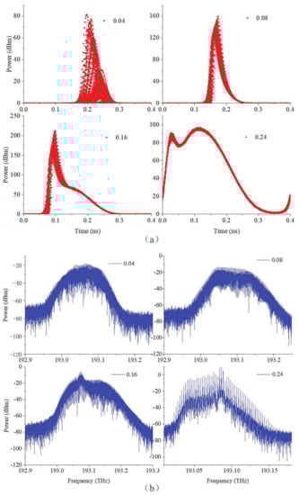 The gain-switched optical pulses with the different bias currents are shown in Figure 2. The modulation frequency is 2.5 GHz and the modulation current is 0.2 A. In Figure 2a, the bias current varies from 0.04 to 0.24 A. At 0.04 A, the relaxation oscillation frequency is 2.49 GHz, the generated optical pulses vary greatly in pulse position and amplitude. The modulation frequency is larger than the relaxation oscillation frequency, and the modulation current to bias current ratio is 5; the spike of relaxation oscillator is not entirely caught. Therefore, the eye diagram exhibits large time and amplitude jitters. The bias current is then switched to 0.08 A, and the relaxation oscillation frequency is 5.24 GHz. Gain-switched optical pulse with less jitters than that at 0.04 A is generated. As the bias current is increased to 0.16 A, the generated optical pulses display a tailing in the trailing edge. The relaxation oscillation frequency is 7.36 GHz and the second spike is excited with power lower than the first spike. Finally, with the bias current set to 0.24 A, the relaxation oscillation frequency is 7.98 GHz. Then, the power of the second spike is enhanced and the generated optical pulse exhibits a two-pronged shape.