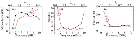 The bandwidth, TNR, and full width at half maximum (FWHM) of the generated optical pulse with different modulation currents and frequencies are shown in Figure 3. The bias current is set to 0.08 A. In Figure 3a, the 10 dB bandwidth is proportional to the modulation current. During the tuning of modulation frequency, the modulation current is set to 0.2 A. As modulation frequency increases, bandwidth increases first and then decreases, presenting a convex function. Then, as shown in Figure 3b, the TNR increases nonlinearly as modulation frequency increases. The optical spectrum presents an optical frequency comb at a high modulation frequency. However, the changing trend of TNR versus modulation current is opposite to that of TNR versus modulation frequency, and spectral lines appear at a low modulation current. In the time domain, as shown in Figure 3c, the FWHM of optical pulse is not sensitive to modulation frequency. As the addition of modulation current, the FWHM of optical pulse first decreases and then becomes stable.