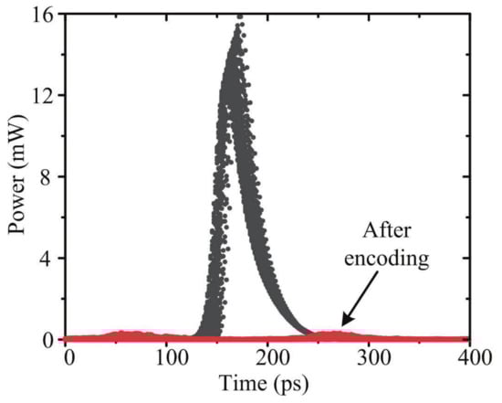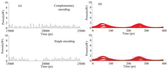 A simple encoding scheme is adopted for the stealth channel to obtain noiselike characteristics. There are m wavelength hopping patterns, and each wavelength pattern has a unique time spread pattern. The time spread pattern is uniformly distributed and the minimum time interval is . As a comparison, the generated optical stealth carrier before and after encoding are shown in Figure 4, in which m is 8. The bias current is 0.08 A and the modulation current is 0.2 A. Being encoded, the signal is spread over time.