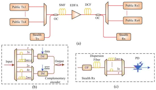 Based on the optical stealth carrier generator, the setup of optical stealth transmission system is shown in Figure 5a. The public channel has 4 wavelength multiplexed users with a wavelength spacing of 0.16 nm. In the public transmitter, the modulation format of public signal is nonreturn-to-zero (NRZ) and the bit rate is 10 Gbps. The multiplexed signals are transmitted over a 50-km single mode fiber (SMF) span. In the public receiver, the public signals are directly detected after dispersion compensation fiber and de-multiplexer. Through optical couplers, the stealth signal is sent to the public channel and separated from the public channel. Typically, a coded stealth signal is sent during a bit interval to represent 0 bits, and no energy is sent during a bit interval to represent 1 bits[,]. Therefore, there is a temporal energy fluctuation when the stealth signal is sent, which exposes the existence of the stealth signal. To avoid the power fluctuation in time domain under continuous 0 bits, a complemented encoding is proposed as shown in Figure 5b. The odd wavelength patterns are modulated by stealth data in the upper branch, while the even wavelength patterns are modulated by inverse stealth data in the lower branch. The insertion loss and time delay of the two branches are equal. In the stealth receiver, as shown in Figure 5c, the public signal and noise are suppressed by an optical filter. Then, the stealth signal is temporally compressed through DCF. The decoder matches the upper branch in the encoder. After decoding, the stealth signal is detected.