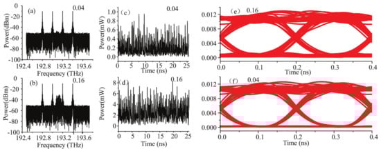 The bias current is the most important factors affecting communication performance of the stealth channel. Therefore, when studying the effect of parameters on covertness, we mainly focus on the bias current. With different bias currents for stealth signal, the optical spectra of public channel are shown in Figure 7a,b. The stealth signal is hidden in the spectral domain when bias current is set to 0.04 A. At 0.16 A, the power of stealth signal power increases, the peak power in the spectral domain is high due to the optical frequency comb characteristics. This high power can easily reveal the presence of the stealth signal. The resolution of the optical spectral analyzer is larger than the symbol rate; the spectral lines cannot be detected in spectral domain. The resolution of the commercial high-precision optical spectral analyzer can reach about 100 MHz. Therefore, for the stealth channel, parameters of the signal generator should be optimized to avoid forming optical frequency combs. Figure 7c,d show the waveform of the stealth signal with different bias currents. After complementary encoding, the stealth signal obtains noiselike temporal characteristics. This feature has not been changed by adjusting bias current. Eye diagrams of the public signal with stealth channel under different currents are shown in Figure 7e,f. When the bias current is 0.16 A, the eye diagram deteriorates due to the increase of signal power. This deterioration can be suppressed by power control in the stealth channel transmitter.