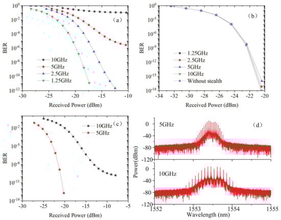 In order to quantitatively analyze the influence of laser parameters on the system performance, the BER performance of the optical stealth transmission system is studied. With different modulation frequencies, the BER curves are shown in Figure 8a. The bias current is 0.08 A and the modulation current is 0.2 A. The BER performance deteriorates with the increase of modulation frequency. The stealth signal can be transmitted error-free over the public channels at 1.25 GHz and 2.5 GHz. Figure 8b shows BER curves of one public channel with stealth signal. The change of the modulation frequency of stealth signal has little effect on the BER performance of public channel. It is verified that the stealth channel has good concealment. After optimizing the laser parameters, the BER results are shown in Figure 8c. Both 10 Gbps and 5 Gbps stealth channel can be transmitted error-free. The bias current is set to 0.13 A and modulation current is set to 0.12 A for the 10 Gbps stealth channel, while the bias current is set to 0.2 A and modulation current is set to 0.1 A for the 5 Gbps stealth channel. However, as shown in Figure 8c, the stealth signal is a clear optical frequency comb in spectral domain. This means the stealth channel has poor concealment in the spectral domain. In addition, it indicates that there is a trade-off between BER performance and covertness of the stealth channel. In order to ensure the spectral covertness of stealth channel, frequency chirp and time jitters of laser outputs are inevitable, and the time jitters will lead to the degradation of BER performance.