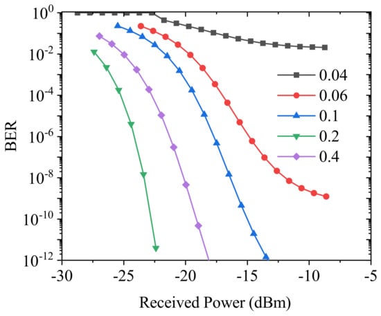 The BER performance of stealth channel with different bias current is also investigated and the BER curves are shown in Figure 9. As bias current increases, the BER decreases. However, when the bias current increases above 0.2 A, the BER will increase. In addition, the high bias current results in the generation of optical frequency comb and the increase of TNR in the spectral domain. Therefore, the bias current of stealth channel should be optimized in terms of transmission performance and covertness. In terms of covertness, the bias current should be decreased to make the TNR less than 3 dB. In the aspect of transmission performance, channel coding for the stealth channel can be used to reduce the BER; especially, the forward error correction schemes employ iteratively decipherable codes. Due to the superiority of decoder complexity and BER performance, low-density parity-check (LDPC) codes [,,] might be good candidates to significantly improve the BER performance of the stealth channel.