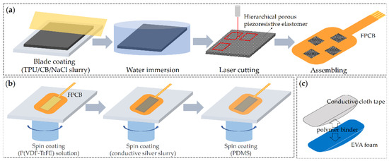 Fabrication of the individual devices, including: (a) piezoresistive sensor array, (b) piezoelectric sensor, and (c) triboelectric sensor.