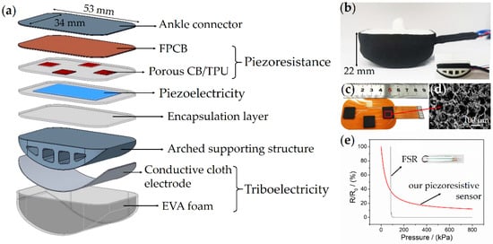 The overall design of FMSS is illustrated in Figure 3a, which consists of three synergistic sensing components and sizes, overall 53 × 34 × 22 mm, which refers to the original foot sole, avoiding the problems of readjusting the control code and recalibration of the foot. The shell layer structure is a wear-resistant EVA foam assembled with a flexible conductive cloth electrode for the identification of induced electrical signals from charged objects. This single electrode triboelectric sensor was fastened to the rigid arched supporting structure by a polymer binder (Figure 2c). The triboelectricity layer has to contact the measured object directly to distinguish the texture, so the triboelectricity layer is conformally wrapped on the outermost layer. Because piezoelectricity responds to impulsive deformation, the piezoelectric sensor, which was encapsulated in the two pieces of EVA foam films, was fixed on top of the arched supporting structure. Layers in piezoresistance need flat full-face contact and a hard substrate to map the force distribution, so they are put under the hard ankle connector and above the the piezoelectric sensor. The cross-arranged piezoresistive array was assembled by four laser-cut hierarchical porous piezoresistive cells (sizes of about 10 × 10 mm) and an FPCB with interdigital electrodes (Figure 2a and Figure 3c) [24,25]. The cross-sectional image of a field-emission scanning electron microscope (FESEM, Supra 55 Sapphire, ZEISS) shows abundant micro- and nano-pores distributed into the conductive elastomer (TPU) uniformly (Figure 3d). Plenty of CB nanoparticles are found across the surface of pore walls resulting in a large number of intricate conductive networks, helping with improving device sensitivity. The integrated piezoresistive sensor was fixed on the lower plane of the ankle connector while also placed on the piezoelectric sensor. Figure 3e shows the typical resistance response curves of the piezoresistive sensor and the commercial FSR, respectively. It can be seen that the FSR sensor gives a near transient resistance in the range of 80–100 kPa with the highest sensitivity; however, once it is over the range, its resistance hardly changed. Such a narrow measurement range cannot meet the demand of the force contact state sensing for the high-loading legged robot. As a comparison, our piezoresistive sensor shows a more stable and wider response curve (20 Pa–800 kPa), as well as the calculated sensitivity of 0.66 kPa−1 (0–100 kPa).