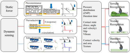 In recent years, new applications demanded new features, such as mechanical flexibility and conformability, and accordingly, new designs and materials for robotic tactile sensing. Diversified flexible sensors, such as a tactile sensor array [14], three-axis force sensor [15], slip detection sensor [16], and texture surface recognition sensor [17], can help robots get environmental information. While the development of tactile sensors for robotic fingertips and hands continued, the application areas, such as motion planning in an unstructured environment, brought whole-body sensing to the fore [18]. In this study, we try to integrate rich tactile information, such as slippage, contact state, texture, and hardness, into a multimodal sensor for giving robots the ability to directly haptic sensing. G. Cheng et al. reported a multimodal sensor integrating proximity, normal force, acceleration, and temperature for humanoid robots [19]. However, in-plane integration of different sensors leads to heterogeneity at different points and cuts off the connection between multimodal messages. Multilayered sensor arrays in a 3D lattice allow greater integration and synchronicity of different sensor modalities that are better suited for the robot sole. Z. Huang et al. reported a stretchable human–machine interface with a four-layer design that offered multimodal sensing [20]. H. Chen et al. developed an electronic skin based on the piezoelectric and triboelectric effects that can sense minuscule stimuli and respond very fast [21]. Overall, the idea of a multimodal sensor is appealing and novel due to the inherent importance of contact sensing for legged robot control, estimation algorithms, contact switch detection, and so on. It is challenging to apply these intricate electronic skin devices into a complex natural environment, especially as a sole sensor. The fabrication and integration of electronic skin with a high spatiotemporal resolution that is lightweight provides tremendous potential applications.