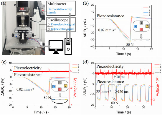 A static calibration system was employed to describe the basic performances of the piezoresistive array, as shown in Figure 5a, including an Instron 5943 electronic universal testing machine, a Keithley DMM6500 digital multimeter with a plug-in scanner card to provide data acquisition (DAQ) of four channels, and computer with the visual pressure display software. Under a vertical loading of 80 N (the weight of a normal quadruped robot divided by four), four piezoresistive cells with approximate resistance response curve fitting can reach the sensitivity of 1.05%/N, as shown in Figure 5b. The sensitivity of packaged FMSS, 0.15%/N, is lower than its original data because of the precompression process during assembling. However, the performances are adequate for most of the legged robots with a heavy weight (10–40 kg) and present excellent linearity in the total range of testing (Figure 5c). In order to prove the robustness and resilience of the assembled sensor, a dynamic testing cycle was implemented. An 80 N force with a loading speed of 30 mm/s was circularly applied to the sensor-mounted foot to mimic the walking locomotion (Figure 5d). The result demonstrates the synchronicity between piezoresistance and piezoelectricity. The observable piezoelectricity signal appears only at on and off moments of the dynamic stimulus, and it is difficult to be induced by a mild static stimulus. Response times of piezoelectricity and piezoresistance are 16 ms and 150 ms, respectively, and the durability of piezoresistance has been demonstrated by our earlier studies [25].