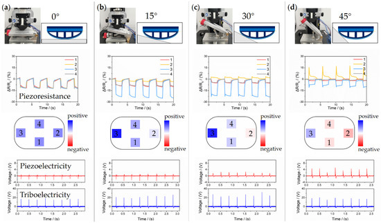 To test the FMSS mounted on the robot foot, different experiments were carried out by mimicking the kick process of the robot. The sloping testing platform placed under the electronic universal testing machine was adjusted to 0, 15, 30, and 45° to represent typical terrains. The varying distribution of pressure caused by the terrain change was measured by the piezoresistive array. In each condition, FMSS’s electronic responses of tri-modal and visual pressure gradation distributions (based on the pressure resistance relation curve of Figure 5c) were recorded in Figure 6. It is well known that a force sensor array can detect a two-dimensional distributed load, and in turn, can calculate the ZMP and shear force. As seen, the pressure of the proximal lattice experiences a higher concentration gradient (positive) compared to the distal lattices when the angle changes from 0 to 30°. As the inclination further increases, the pressure gradually turned into the pushing force (negative) because of the arcing configuration of FMSS. This changing process of force vector (from “press” to “push”) is also recorded by the variable polarity and amplitude of the piezoelectric signals. Although the amplitude-angle correspondence is nonlinear, through methods of machine learning and deep learning, the result can help improve the robustness of the force angle and distribution calculation from the piezoresistive array. However, triboelectricity retains the same characteristic waveform; the slight change of intensity is due to the different contact areas between FMSS and the testing platform. Therefore, by using the simultaneous extraction of piezoresistive and piezoelectric signals, the hybrid tactile sensor can accurately identify contact state and pressure distribution caused by rugged ground surfaces and motion patterns and has great potential in intelligent real-time feedback control of robotic locomotion.