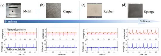In order to recognize the hardness of an object, a squeezing process by kicking is necessary. Note that this is only possible through active perception since a static reading of tactile information is not sufficient for the hardness. Here, the dynamics of the restored sensation could help discriminate specific object characteristics. Fortunately, FMSS integrated the double-modal dynamic sensing of two different action mechanisms. For testing the sensor, we recorded the vertical hitting data from four types of objects with similar thickness, consisting of a metal platform, a carpet, a rubber block, and a sponge block, as shown in Figure 8. Contact time and waveform can reflect the hardness. Long contact time means relatively low rebound speed. For example, the highest voltage magnitude and the biggest bandwidth of piezoelectricity appeared on the deformable sponge sample, and the obvious negative voltage signals were recorded on the harder objects. Furthermore, the resolution capability of triboelectricity mainly derives from the differentiation of the triboelectric series of materials [31], texture, contact velocity, and area. For example, as the EVA is triboelectrically positive compared with the rubber, the rubber more readily obtains the electrons from the contact interface of EVA, thus a minus triboelectric voltage. Therefore, the synergy information can efficiently improve the overall recognition accuracy of ground hardness and skidding situations (dynamic contact time and vibration).