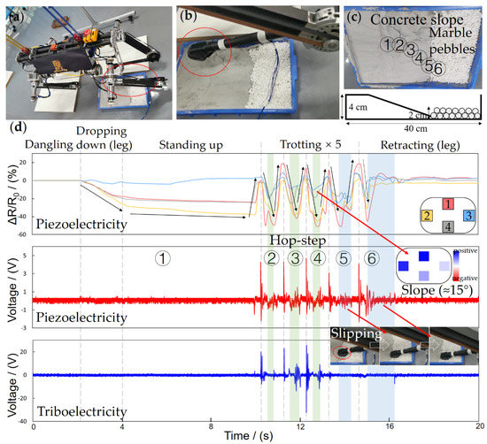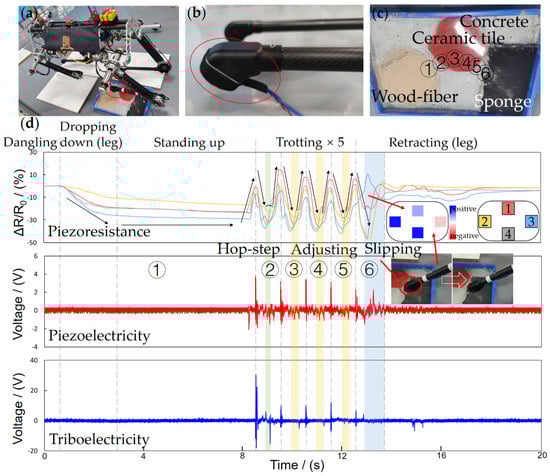 The experiment of FMSS mounted on the foot of (a,b) a large size quadruped robot Pegasus without changing the original quadruped foot and leg design. (c) The floor pad design with different terrains and step points follows the order from 1 to 6. (d) FMSS signals in the whole process, which are separated into five states according to the robot’s movements.