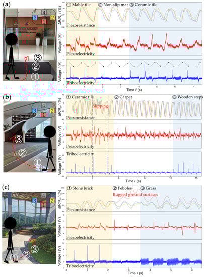 Learning locomotion from animals and human beings is also a hot research direction. FMSS can be used as an important supplement in analyzing and imitating human walking. The FMSS was mounted on one of the human tester’s shoe soles to record the tactile feedback of human locomotion. Then the human tester equipped with FMSS on the sole walked through three scenarios that included some typical kinds of terrains, as shown in Figure 11. Different from robots, the piezoresistive array readings vary in every step cycle, and four sensors in the array show less synchronization than a robot, which means humans adapt their gait and contact location order constantly according to the slightest change. The piezoelectric signal pulses are gentler compared to the experiment on the quadruped robot but still clear enough for the state switch judgment, which pictures a soft-landing process different from a simple mass-spring-damper model. The textures can preliminary be distinguished by the triboelectric signal wave patterns, which have shown a strong feature in the wave pattern (for example, in Figure 11c, stone brick, pebbles, and grass). FMSS proved its effectiveness and adaptability in a more complex application scenario. What is learned from human locomotion through FMSS may provide new ideas and control strategies for agile robot maneuvers [34].