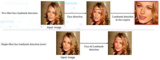 As shown in Figure 1, in the previous face landmark detection model, an input image is inputted to a face region detection model, which returns bounding box coordinates for the face region. The bounding box coordinates are then used to crop the face region, which is subsequently inputted to a face landmark detection model to obtain the landmark coordinates. Clearly, there are two steps in this method: face region detection and landmark detection. As mentioned previously, landmark detection is influenced by the face region detection model. In addition, the prediction speed is inconsistent because the number of face landmarks that must be detected is as many as the number of faces in the image.