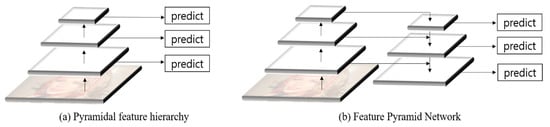 Structure of the feature map used in SSD and YOLOv3: (a) Pyramidal feature hierarchy method used in SSD, and (b) feature pyramid network method similar to that used in YOLOv3.