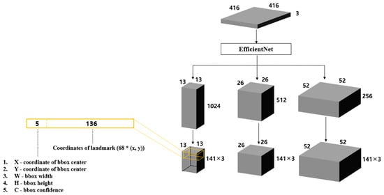 The proposed model differs from the original YOLOv3 model in that it predicts the coordinates of the landmark rather than predicting the class of the object in the bounding box. In the original YOLOv3, when the input image is divided into S × S cells, each cell contains information about the bounding box and class probability. We modified the model to leave the information about the bounding box and added the coordinates of the landmark instead of the class probability. If an input image of size 416 × 416 × 3 is inputted to the model, feature maps with three scales, 52 × 52 × 256, 26 × 26 × 512, and 13 × 13 × 1024, are outputted. When the number of landmarks is 68, each cell has 141 parameters by adding 136 coordinates of the landmark and five pieces of information about the bounding box. Therefore, to extract the face region and face landmark information, each feature map is matched to a 141 × 3 channel. Figure 3 shows the structure of the proposed model.