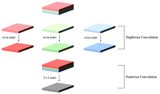In EfficientNet, a depth-wise separable convolution procedure, which combines depth-wise convolution and pointwise convolution, is applied. Convolution operation utilizing each kernel by splitting each channel is known as depth-wise convolution, and the input and output channels are always the same. Pointwise convolution is a convolution operation that uses a 1 × 1 kernel to modify the output channel. This can drastically reduce the number of parameters, which increases the speed, and the performance does not decrease significantly. Figure 4 shows the depth-wise separable convolution method. In addition, a compound scaling method is used to improve the model performance. Previously, methods for improving the performance of the convolution network involved simply deepening the network or widening it, or changing the size of the model based on the image resolution. EfficientNet shows good performance through the compound scaling method, which scales the depth, width, and resolution of the network evenly. Therefore, EfficientNet-B0, which is a baseline network in EfficientNet, was used for the single-shot detection model.