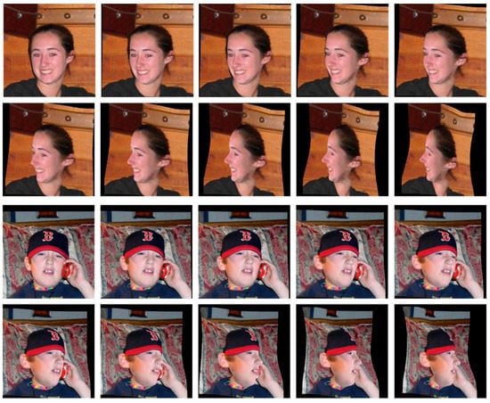 We used 300 W across large poses (300W-LP) [] to train the model. The 300W-LP is a database that applies the rotation of 3D images to 300 W [] for data augmentation, and is a standardized database of 68 landmarks for HELEN [], LFPW [], and AFW []. The total amount of data for 300W-LP is 122,450. The 300W-LP is composed of images taken from various angles, from the front to the sides, by applying rotation to the human face. Images of one person are included only in the training set or test set. That is, the person used in the training set is not reused in the test set. Figure 5 shows an example image. For training, the data were separated into a training set (97,967) and a validation set (22,035). The evaluation included the remaining data (Helen: 1616, LFPW test set: 832) that were not used for the training.