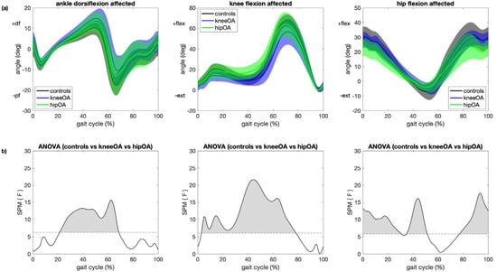 Comparison between all participant groups. (a) Mean and 1 standard deviation joint angle trajectories for ankle dorsiflexion (left), knee flexion (center) and hip flexion (right) angle for the affected/left leg for patients with knee OA (blue), patients with hip OA (green) and controls (black); (b) results of statistical parametric mapping with analysis of variance (SPM{F}) where regions with statistically significant difference between all groups are indicated as grey regions (p < 0.05).