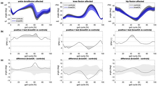 Comparison between patients with knee OA and controls. (a) Mean and 1 standard deviation joint angle trajectories for ankle dorsiflexion (left), knee flexion (center) and hip flexion (right) angle for the affected/left leg for patients with knee OA (blue) and controls (black); (b) results of statistical parametric mapping with posthoc t tests (SPM{t}) where regions with statistically significant difference between groups are indicated as grey regions (p < 0.05/3); (c) mean joint angle deviation from the control group for patients with knee OA where grey areas illustrate ±1 SD of the joint angles of the control group.