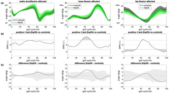 For the kinematic trajectories, we tested the null hypothesis that there are no differences in 1D kinematic data between patients with knee OA, patients with hip OA and asymptomatic control subjects. We examined the entire time normalized mean kinematic trajectories using SPM. All SPM analyses were conducted in Matlab (MathWorks Inc., Natick, MA, USA) using the opensource software package spm1D 0.4 (www.spm1d.org; accessed on 15 January 2021) []. Between-group statistical analyses were conducted as described by Pataky []. Briefly, an ANOVA was performed for each joint to detect an overall group effect. Independent sample t-tests were performed to compare pairs of groups in a posthoc analysis. The null hypothesis was rejected if the experimentally computed t-value for trajectory 1D data exceeded the critical value that was calculated based on Gaussian random field theory. The significance level was set to 0.05 for the ANOVA of the SPM analysis and to 0.05/3 for the posthoc t-tests for independent samples with Bonferroni adjustment.
