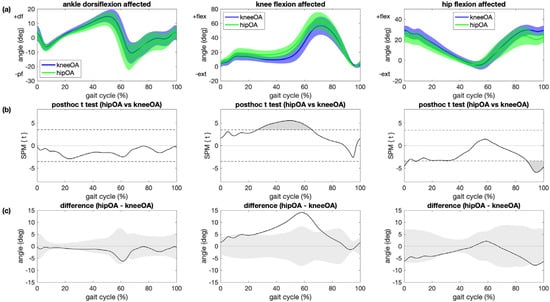 Comparison between patients with knee OA and patients with hip. (a) Mean and 1 standard deviation joint angle trajectories for ankle dorsiflexion (left), knee flexion (center) and hip flexion (right) angle for the affected leg for patients with knee OA (blue) and patients with hip OA (green); (b) results of statistical parametric mapping with posthoc t tests (SPM{t}) where regions with statistically significant difference between groups are indicated as grey regions (p < 0.05/3); (c) mean joint angle deviation from patients with knee OA for patients with hip OA where grey areas illustrate ±1 SD of the joint angles of the control group.