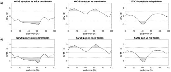 Association between KOOS subscores and kinematic trajectories. Results of statistical parametric mapping with regression analysis (SPM{t}) are shown for (a) the KOOS subscore symptoms and (b) the KOOS subscore pain and the ankle (left), knee (center) and hip (right) of the affected/left leg where grey areas illustrate regions with statistically significant relationships between KOOS subscores and kinematics (p < 0.05).