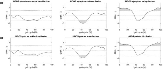Association between HOOS subscores and kinematic trajectories. Results of statistical parametric mapping with regression analysis (SPM{t}) are shown for (a) the HOOS subscore symptoms and (b) the HOOS subscore pain and the ankle (left), knee (center) and hip (right) of the affected/left leg where grey areas illustrate regions with statistically significant relationships between HOOS subscores and kinematics (p < 0.05).