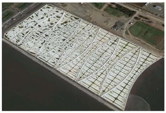 A high-density polyethylene (HDPE) geomembrane (called the “membrane” in this paper) has the advantages of high stiffness and tensile strength, as well as good chemical resistance. Such membranes have been extensively applied in sewage treatment plants, landfill covers, and waste degradation plants as a cover material to prevent the diffusion of contaminants []. In the Western Treatment Plant (WTP) of the Melbourne Water Corporation (MWC), Victoria, Australia, several large-scale HDPE geomembranes are deployed as floating covers on anaerobic degradation lagoons. As shown in Figure 1, these 2 mm thick membranes, spanning an area of approximately 475 m × 216 m, are installed on the top of lagoons where they float on raw sewage. These covers capture the anaerobic processes that go on in these lagoons and release biogas, odours, and greenhouses gases. These biogases also constitute a renewable energy source and each floating cover can capture up to 65,000 m3 of biogas per day, which is used to produce 7 MW of electrical energy [].