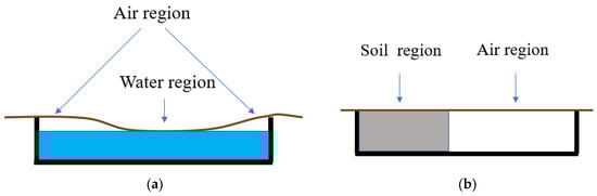 Side profiles of test rig. (a) membrane on air and water; (b) membrane on air and soil.