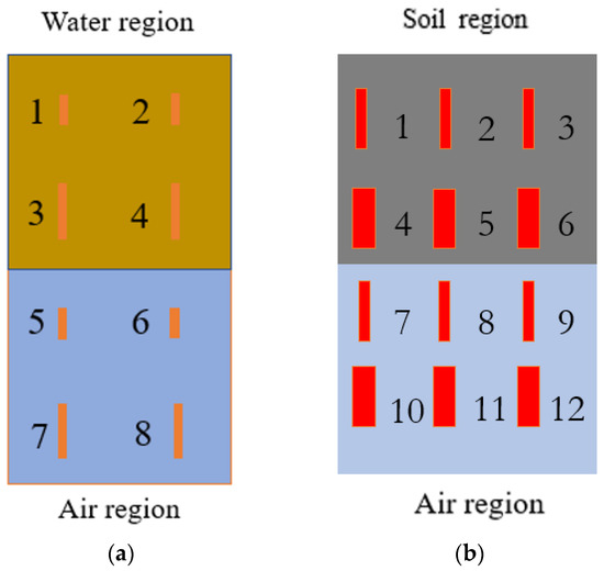 Figure 9b shows a map of the cooling constant obtained from Newton’s cooling law method. The boundary between the soil and air regions can again be clearly identified on the map. However, the defects in the air region are not visible, and there is only a faint indication of defects 4–6 in the soil region.