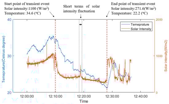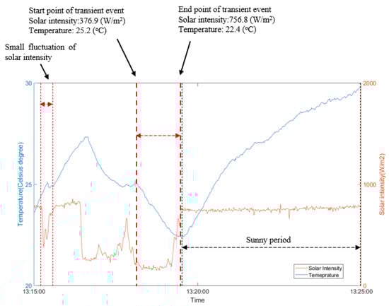 The quasi-active thermal inspection commenced at 12:00:00 during a period of high solar intensity, as shown in Figure 8. A cloud shading event occurred from 12:10:00 to 12:27:45. Local solar intensity decreased from 1100 W/m2 to 271.6 W/m2 (a change of 828 W/m2). This event resulted in a temperature reduction of 12.4 °C, which was enough for the thermal transient analysis. A short fluctuation in solar intensity was also noted at 12:18:00 during the transient event, but it lasted less than 30 s and did not lead to a significant change in the temperature response of the membrane. Therefore, this fluctuation can be ignored for the purposes of transient thermal analysis.