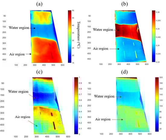 The results are shown in Figure 7. They are evaluated based on: (1) the ability to distinguish between the substrates; and (2) the ability to identify subsurface defects. The raw thermal image, shown in Figure 7a was taken at the midpoint of the transient event. In this image, the water region can be distinguished due to its significantly lower temperature, the defects are visible but their profiles are not clear.