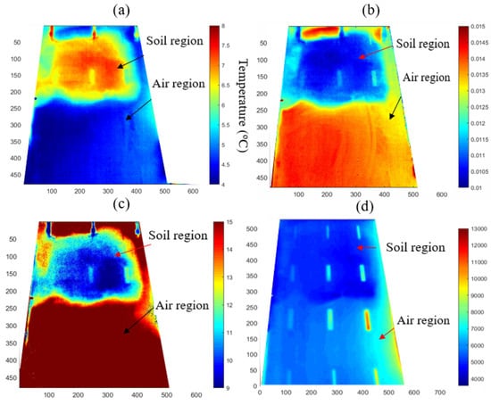 The three methods described in Section 3 were applied and the results are presented in Figure 9. Figure 9a shows a single frame of the raw thermal image, which was taken at the mid-point of the transient events (12:20:00) with the colour bar showing the range of the temperature. The single frame raw thermal image presented in Figure 9a shows high thermal contrast between the soil region and the air region, defects in the soil region are visible, but defects in the air region are not visible.