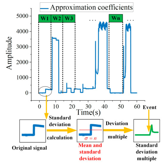 After the active power sequence is decomposed by wavelet, is obtained. Then, the standard deviation of is analyzed. The deviation multiple of the standard deviation at the switching time of appliance is significantly higher than steady operation. Generally speaking, the threshold of event detection can reach three or more. If the standard deviation of ten consecutive points exceeds by more than three, it can be considered that there is appliance switching on behavior. Likewise, the standard deviation of ten consecutive points exceeds less than −three, it can be considered that there is appliance switching off behavior. The event detection using this method is shown in Figure 5. W1, W2, ···, Wn are the windows for mean operation. The is obtained by calculating the deviation multiple in each window for each point. When there are consecutive points greater than or less than the threshold, it is considered that there is an switching behavior of the appliance. In this method, the length of the window and the continuous deviation length varies for different appliances.