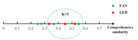 The comprehensive similarity is listed in a descending order for the top-K largest ones. Further, the ratio of potential appliance is determined in this top-K nearest neighbors. In Figure 7, the K is preset as five, which means that the top five comprehensive similarity is selected for weighted KNN clustering. Among the top five comprehensive similarity, there are three potential LEDs and two potential FANs, which indicates a clustering result that the appliance is LED with a 60% (3/5) confidence.