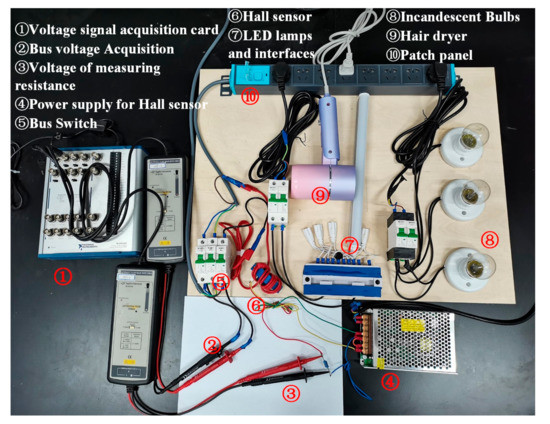 The NILM experimental platform is shown in Figure 8. The platform consists of a grid interface, data acquisition card, a bus splitter, processing unit, and appliances to be tested. The circuit breaker is used to control the switching of appliances. The training and testing sets are established by logging the switching data of various appliances. For load aliasing purpose, the bus splitter is used to conjunct appliances into the bus to simulate actual energy consumption scenarios.