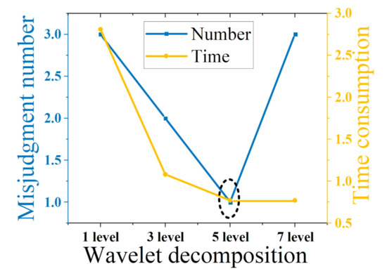 Table 5 shows the events detection results under different wavelet decomposition levels. For the 1-level and 3-levels decomposition, as the number of layers increases, the accuracy of events detection increases, but the computation requirement decreases. When the number of layers continues to increase, the computation requirements changes little while even more mis-detections are observed. This is due to the fact that as the number of decomposition layers increases, high-frequency information is lost. Figure 10 shows that the 5-levels decomposition is optimal.