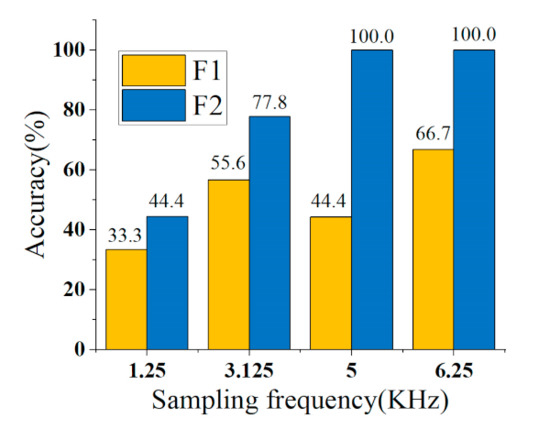 Many appliances start up with several stages, such as MCs and SCRs, in this paper. Therefore, the starting stages of such appliances are separately regarded as different loads. The effectiveness of overshoot multiples is verified by introducing two types of training sets, which represents the experiment without and with overshoot multiples as F1 and F2, respectively. F1 is the training set using V-I trajectory + harmonics, and F2 is the training set using V-I trajectory + harmonics + . Additionally, the experimental results are compared under different sampling frequencies.