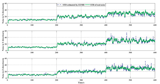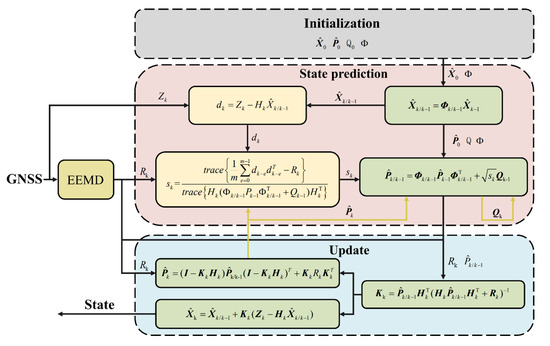 10], the dynamic adaptive Kalman filter (DAKF) based on ensemble empirical mode decomposition (EEMD) is designed. This method applies EEMD to the noise extraction of multi-channel GNSS signals and estimates the noise variance to dynamically adjust the observation noise covariance matrix R. Then, through the comparison of the actual and theoretical innovation sequences, Q is adaptively modified [
