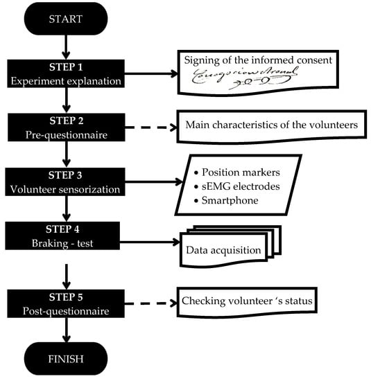 - Pre-questionnaire (step 2): The first questionnaire was delivered before the emergency braking test and was planned to gather the anthropometric information of the volunteers, such as the height, weight, gender, or age, among others. In addition, this test was designed with the idea of detecting if the volunteer was unhealthy and could have some injury during the braking emergency test.