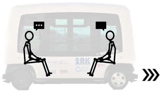 - Emergency Braking Test 2 (BT2): The autonomous bus drives forward and the subject is sitting in the direction of travel (forward). Another person is sitting in front of him (Figure 2) to talk while the experiment is developed. Suddenly, the bus brakes and there is an acoustic warning to advised about it.